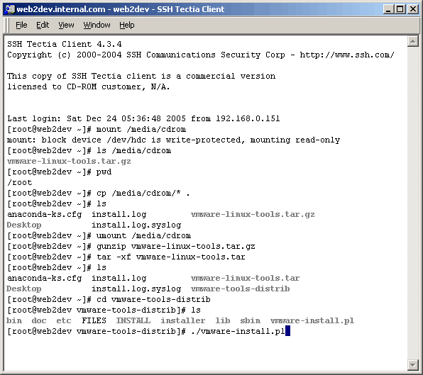Now that the virtual CDROM is available, we login (ssh) as root, mount it, copy over