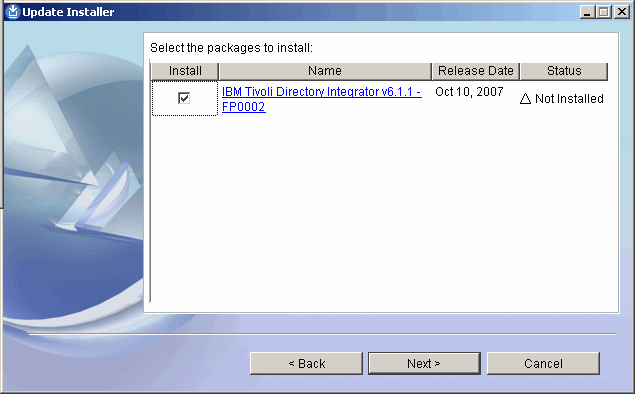 The installer found the fix pack. Click Next to continue.